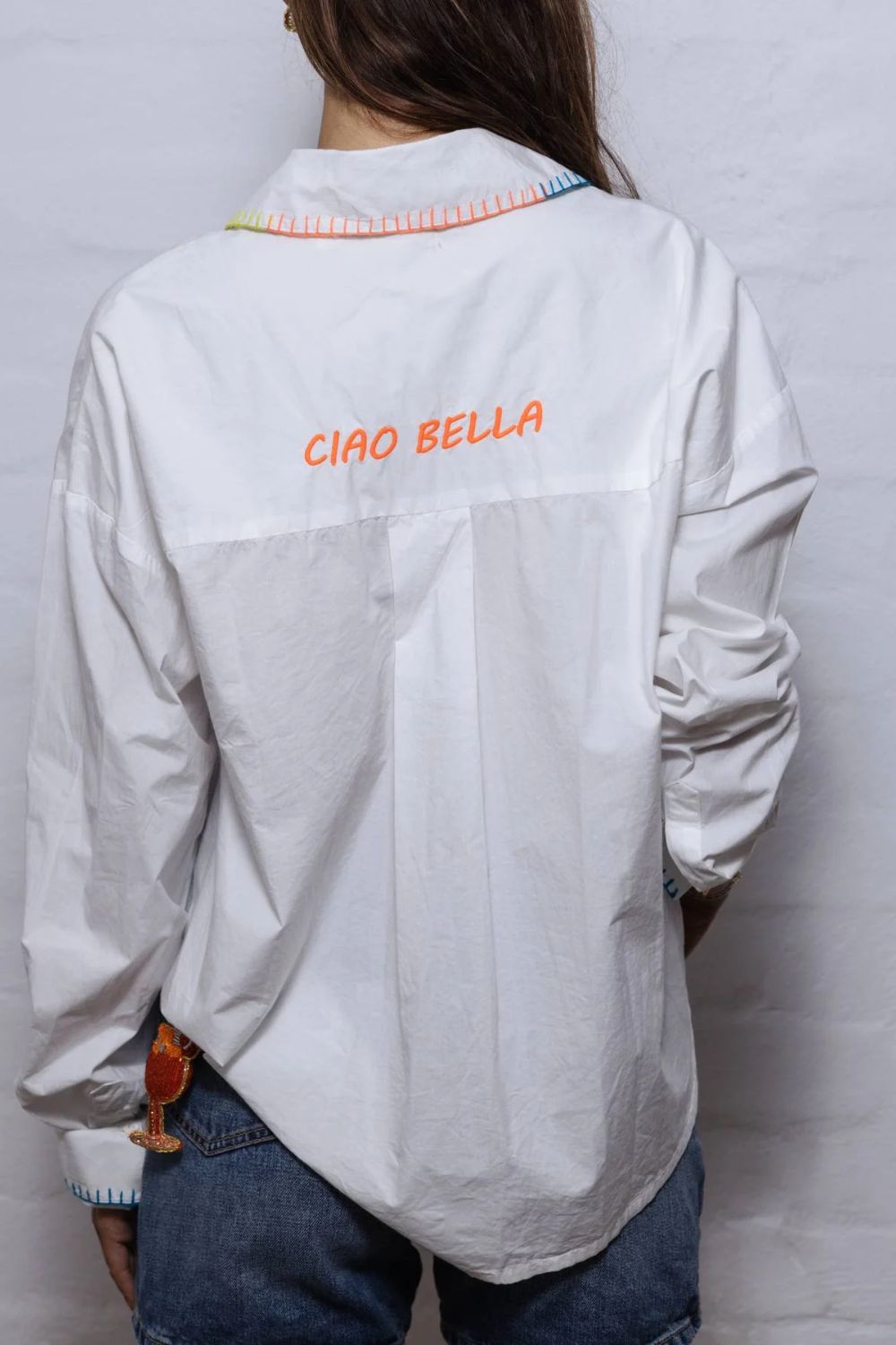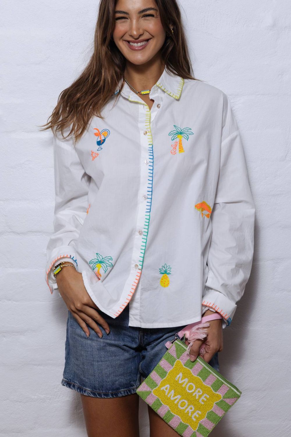 Bring a splash of holiday fun to your wardrobe with the Island Spritz Solana Shirt. Made from 100% cotton, this relaxed-fit style is soft, breathable, and ideal for warm, sunny days. The crisp white base is decorated with colourful embroidered motifs—cocktails, pineapples and palm trees, creating a cheerful, island-inspired look. Along the back, “Ciao Bella” is embroidered in bright orange for a playful finishing touch. The button placket, collar, and cuffs are trimmed with rainbow stitching, adding even more vibrant charm.