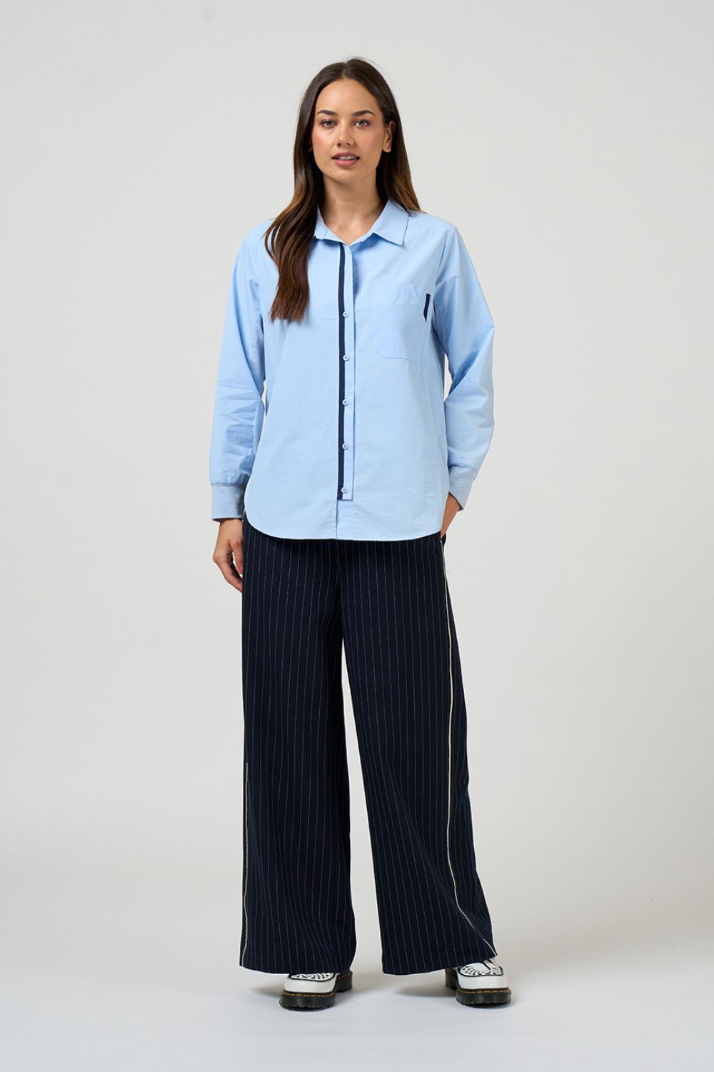 A modern take on the classic women’s button-through shirt, the Madly Sweetly Mixed Media Shirt in Sky blends crisp cotton shirting with contemporary detailing. The contrast tape highlights the front button stand and cut-away pocket, adding subtle interest to this polished everyday piece. Ribbed cuffs bring a mixed-media element, while the curved shirt-tail hem creates a flattering shape that can be worn loose or tucked.