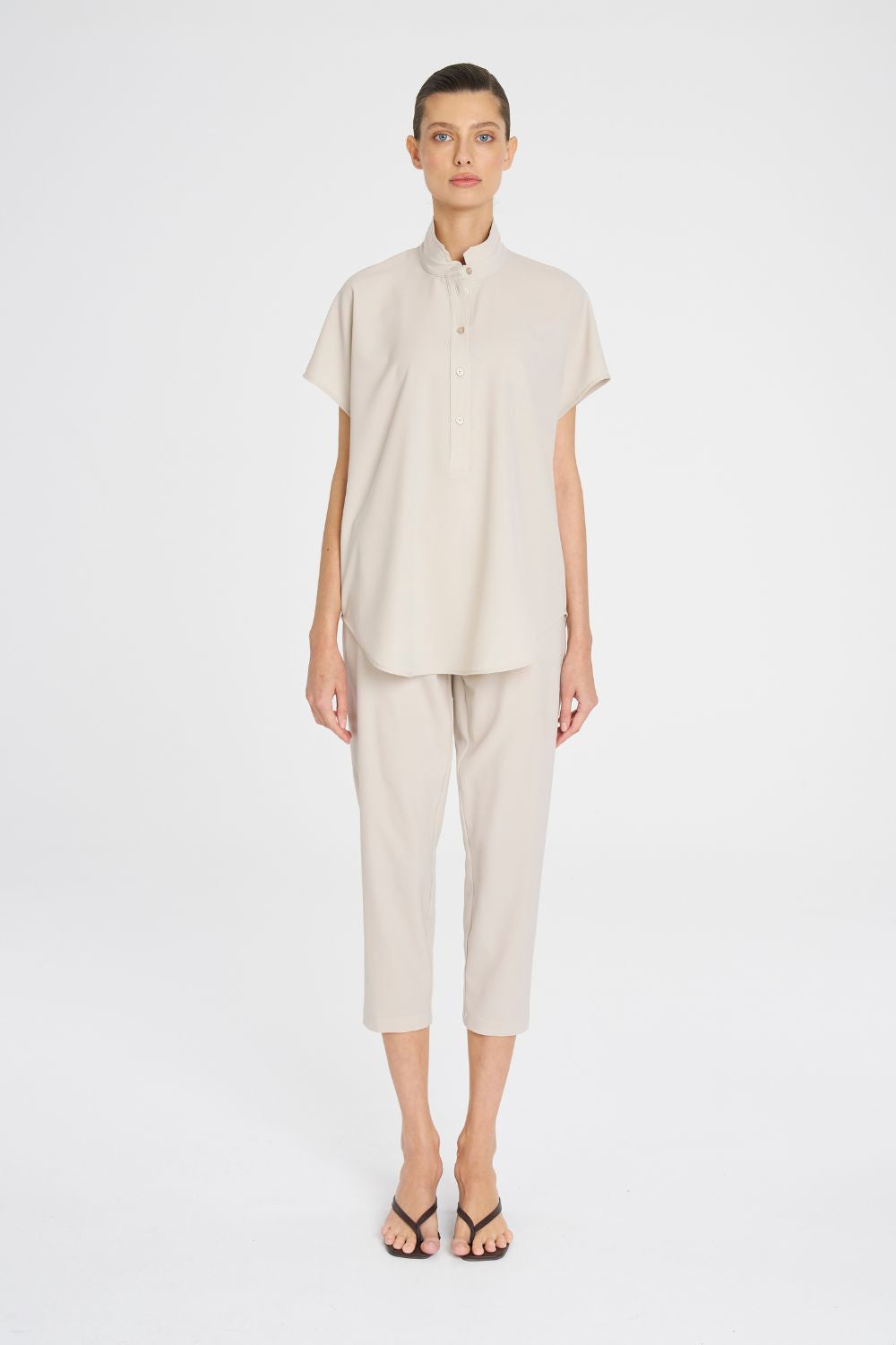 The Mela Purdie Tab Stand Shell is crafted from the brand’s Flex Weave, a minimalist twill with a matte finish that offers structure and fluidity for a polished, versatile silhouette. It features a crisp front placket with button closure, a stand collar, and cap sleeves, finished with a dramatic curved hemline for a modern, flattering shape.
