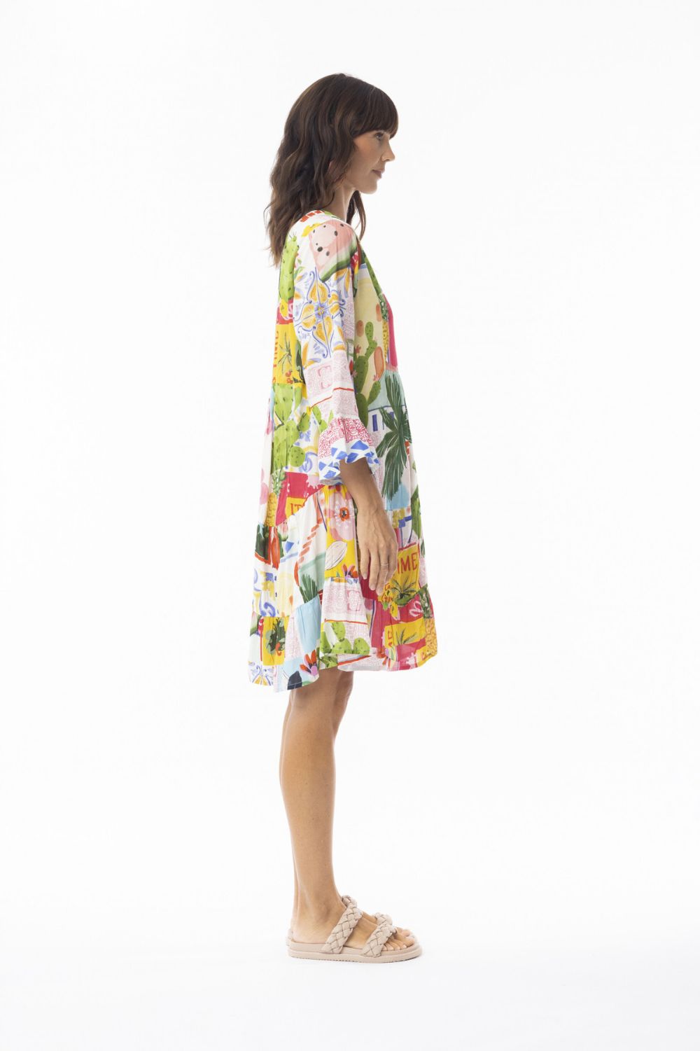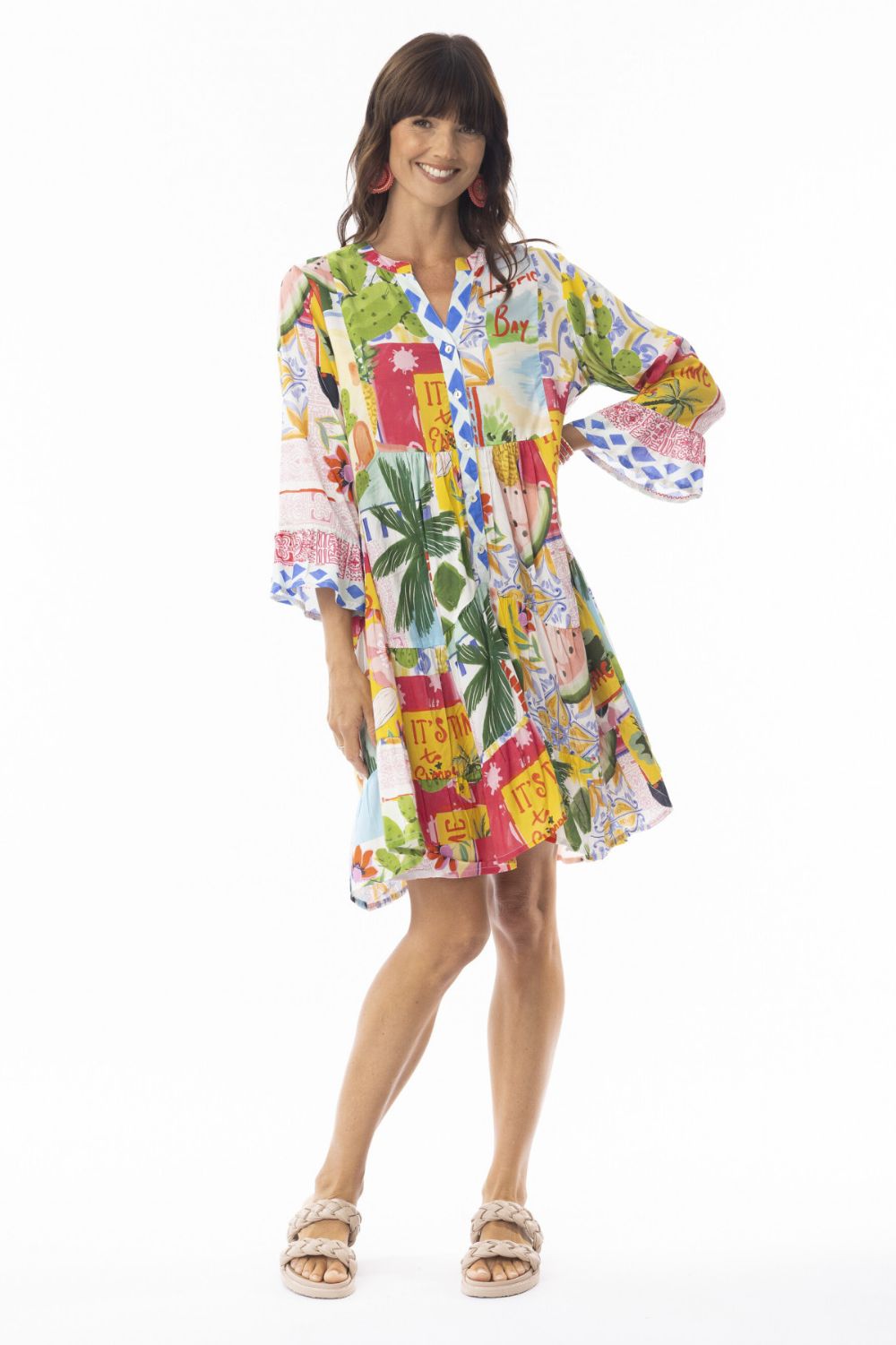 Infused with coastal charm, the Orientique Erica Tiered Dress – Cactus Coast captures the carefree spirit of summer. Crafted from soft 100% rayon, this lightweight design features a button-up mandarin collar, tiered skirt and three-quarter frill sleeves that bring a feminine touch. The tropical-inspired print bursts with vibrant colour, evoking memories of sunny getaways and seaside strolls. A relaxed silhouette makes it the perfect dress for holidays, long lunches or weekend wanderings.