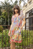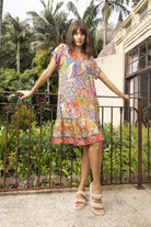 Be transported to sunlit destinations in the timeless Francesca Dress in Marcella. Crafted from 100% rayon, this soft, breathable maxi dress combines comfort with striking bohemian charm. Featuring capped sleeves, flattering triangle panels at the bust, and shirring at the back for the perfect fit, it flows effortlessly into a frilled hemline. The ornate kaleidoscope print and warm, vibrant tones make it a standout choice for any summer occasion.