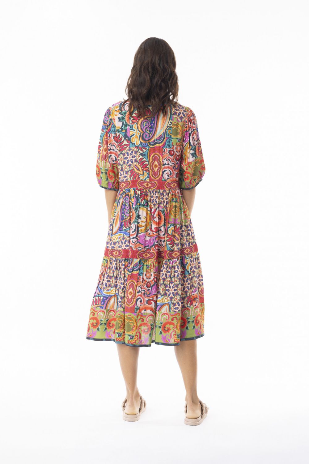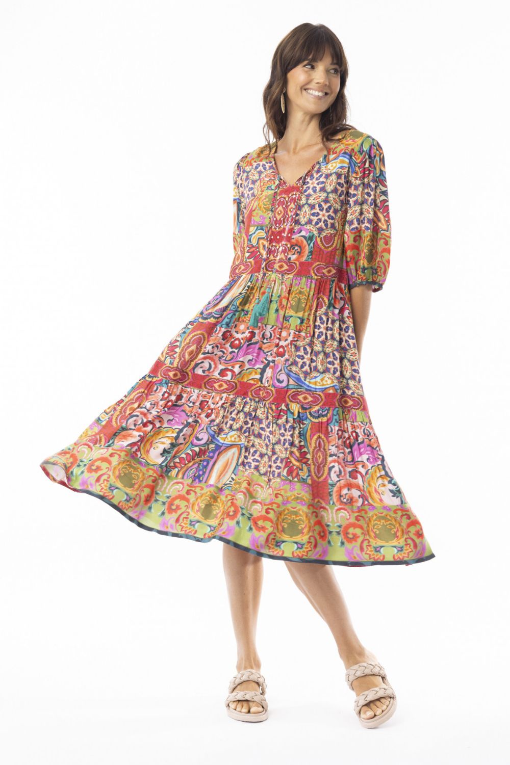 Awaken your sense of wanderlust in the vibrant Francesca Tassel Tier Dress in Marcella. Crafted from 100% rayon, this flowing dress combines soft comfort with artistic flair. Featuring a relaxed fit, gathered half sleeves, and a tiered skirt, it creates a breezy, feminine silhouette that flatters every figure. The ornate kaleidoscope print in bright, joyful colours brings a touch of bohemian charm, while the tassel neckline adds a playful finish—perfect for sun-drenched days and balmy evenings.