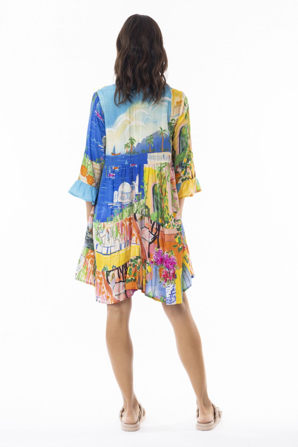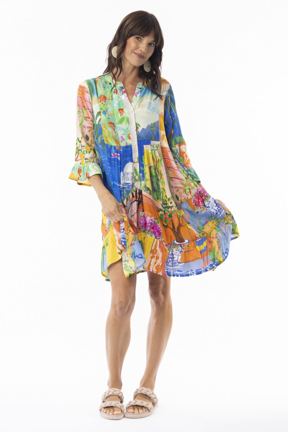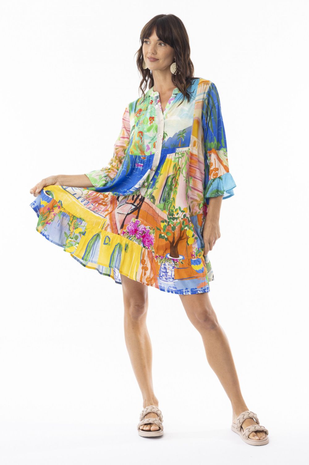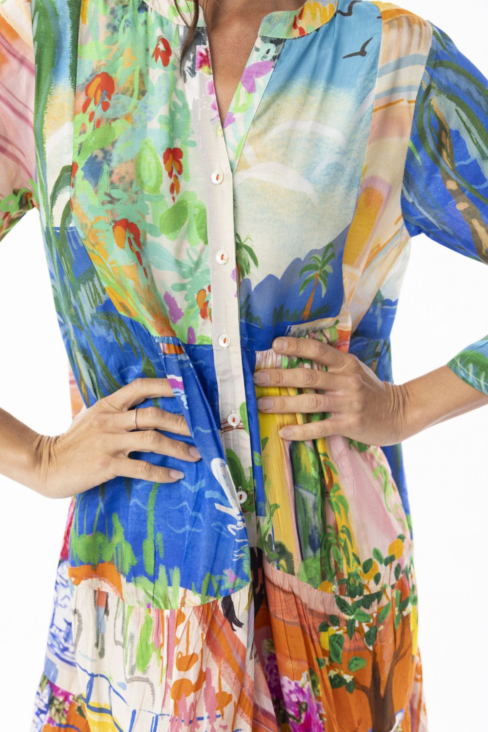 Be swept away by the radiant Sardinia Tiered Dress, featuring vibrant waterscape and terracotta garden prints on a soft, flowing 100% rayon fabric. With a button-up mandarin collar, three-quarter frill sleeves, and a tiered knee-length skirt, this dress is effortlessly chic and easy to wear.