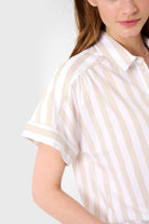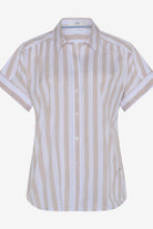 The Viv blouse captures the essence of summer with its fresh appearance. It features dropped shoulders, a classic shirt collar, and an oversized fit. Ruching along the shoulder yoke and a rounded hem complete the look. The blouse is made of striped poplin fabric, a blend of cotton and viscose, ensuring a soft, skin-friendly quality, colour fastness, and easy care.