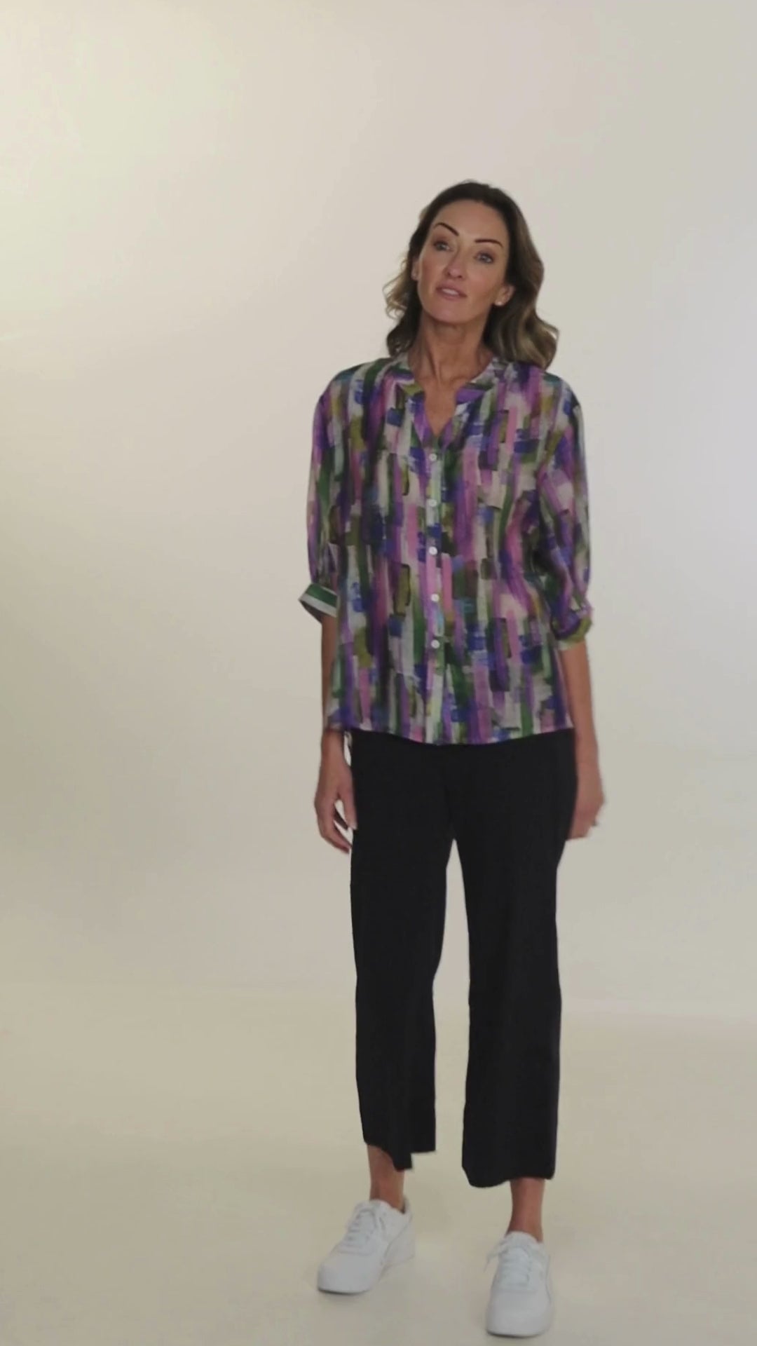 The Belina Print Shirt from our Silvermaple Collection brings effortless style to your everyday wardrobe. Crafted from a soft silk-feel blend of viscose and nylon, it features an open V-neckline with mandarin collar, 3/4 puff sleeves with button closure, and a functional front button placket. The abstract print and back button detail add a contemporary edge, while the curved hi-low hem and generous fit create a flattering, easy-wear silhouette.