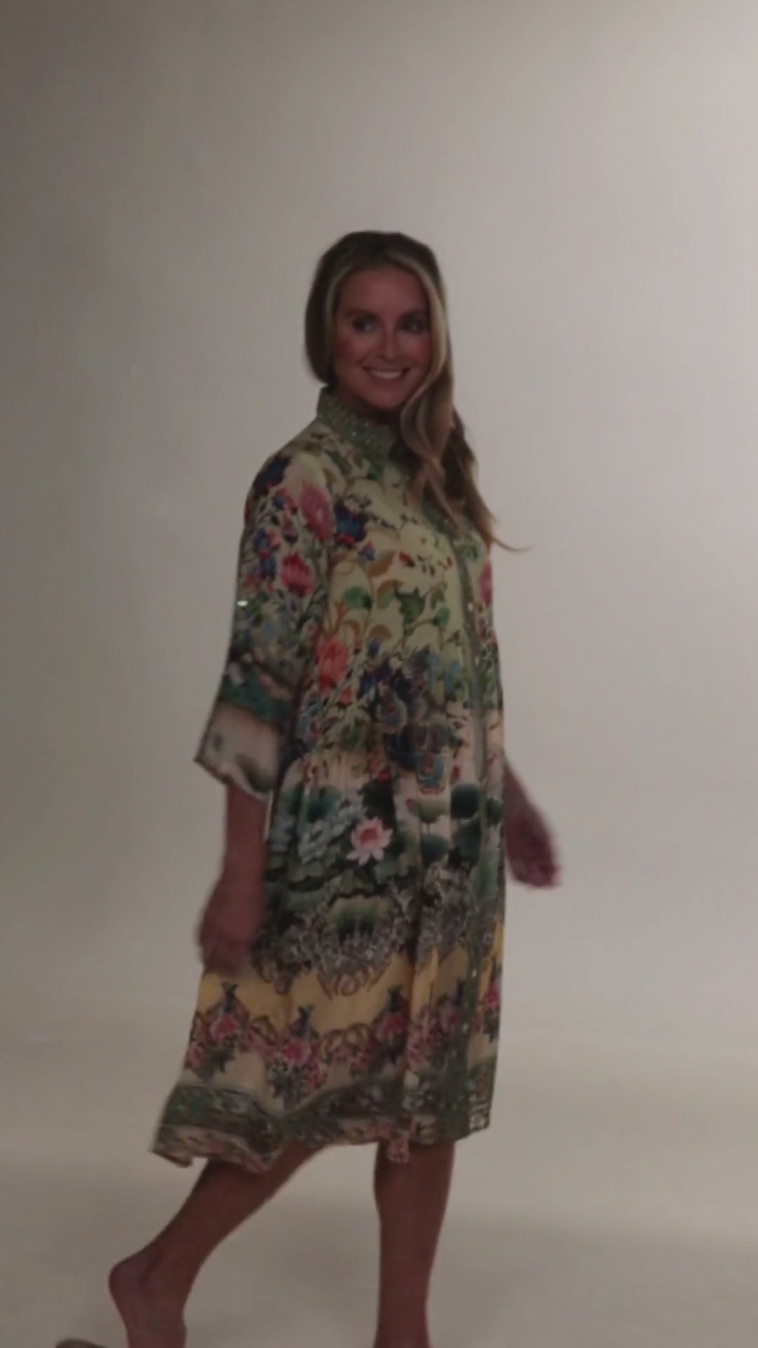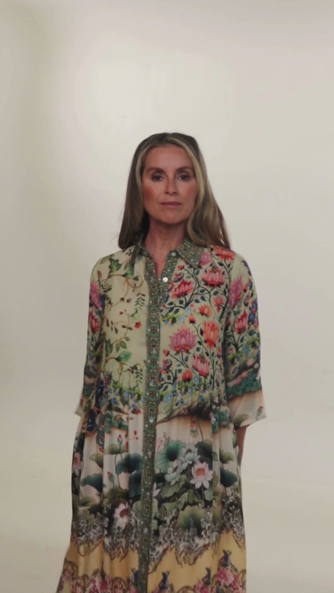 The Celeste Button Through Dress in Lotus Garden is a soft and serene piece that exudes effortless elegance. Crafted from lightweight viscose linen, it drapes beautifully and keeps you comfortable in warm weather. The delicate print blends soft greens and yellows with lotus florals and subtle gold accents, evoking a tranquil, oriental-inspired scene. A V-neckline and button-through front bring gentle structure to the flowing silhouette, while 7/8 sleeves with button tabs and a slightly gathered hem panel enhance movement and feminine charm.