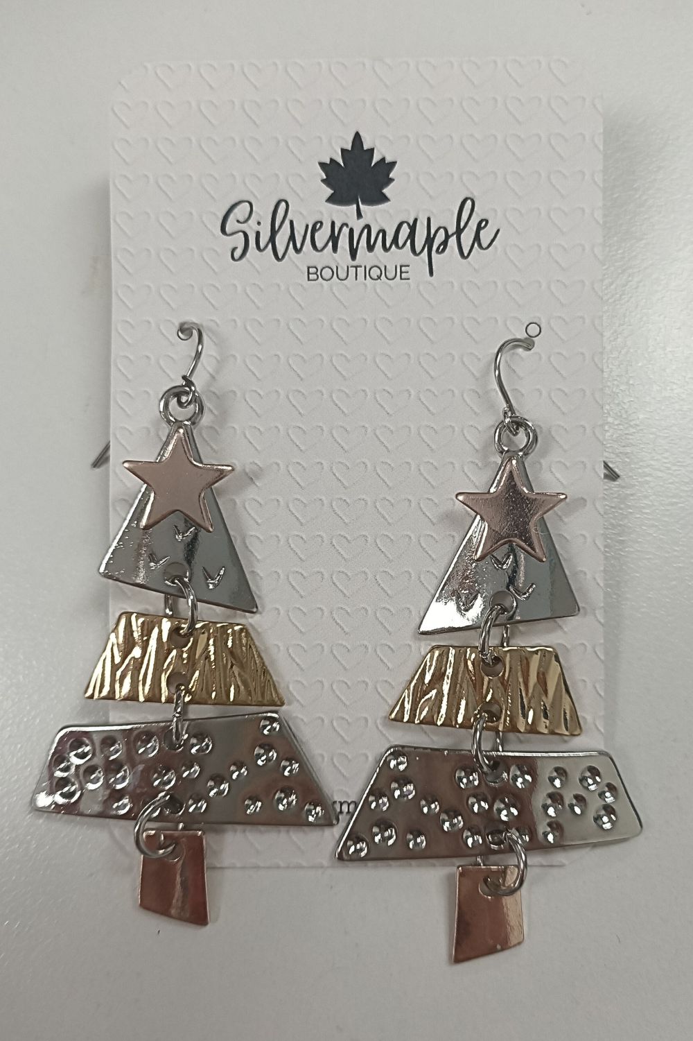 Add a touch of elegance to your holiday look with these stunning metallic Christmas Tree earrings! Featuring a blend of gold/silver or rose gold/silver segments, each tree is adorned with intricate textures and topped with a shining gold star. Perfect for festive parties or sophisticated gifting, these lightweight, eye-catching earrings bring a glamorous flair to any outfit and ensure comfort all day or night.