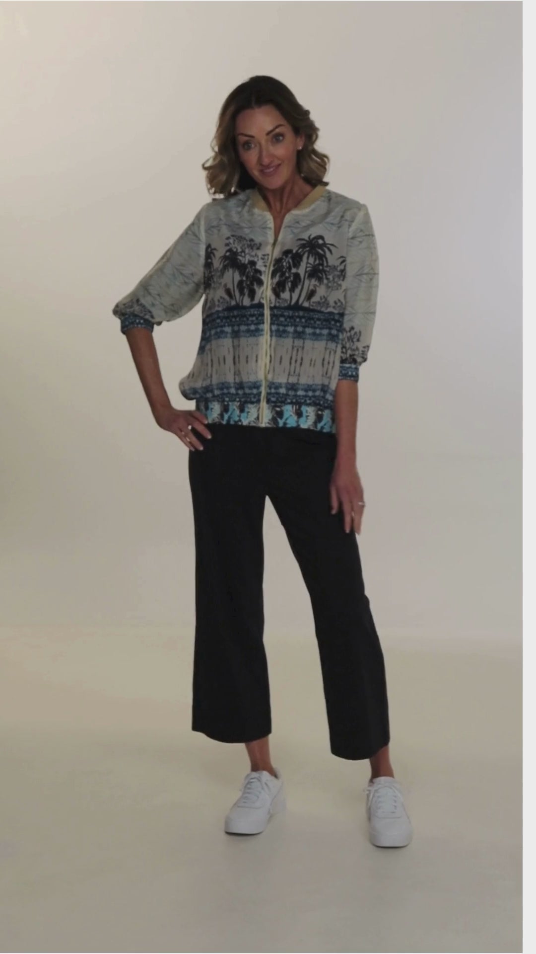 The Diaz Bomber Jacket in Heron Bay is a serene, lightweight layer that adds effortless style to your everyday wardrobe. Crafted from breathable viscose, it drapes beautifully while keeping you comfortable in trans-seasonal weather. Featuring a calm white base with navy palms and heron motifs, the print evokes a tranquil, coastal-inspired aesthetic. A ribbed neckline with a touch of gold thread adds subtle shimmer, and the polished gold zip completes the refined finish.