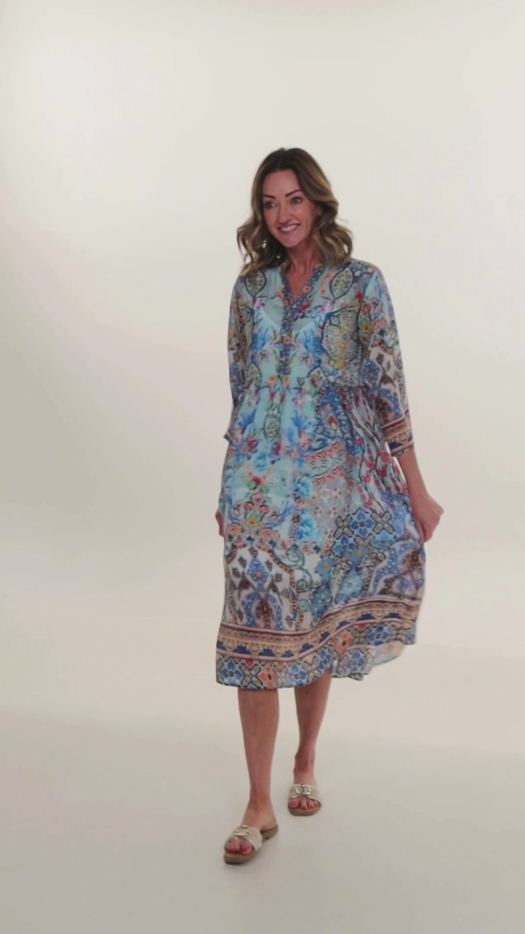 From our Silvermaple Collection, the Erin V-Neck Dress captures the essence of relaxed elegance in a statement summer print. Crafted from soft, breathable viscose crepe, it drapes beautifully for an easy, feminine fit. The Santorini Tile print features a blue base with intricate mosaic-inspired motifs, softened by touches of paisley and florals that echo the charm of Mediterranean artistry. Designed with a flattering V-neckline, extended empire waist, and effortless pull-on style, this dress is a timeless piece you’ll reach for all season long.