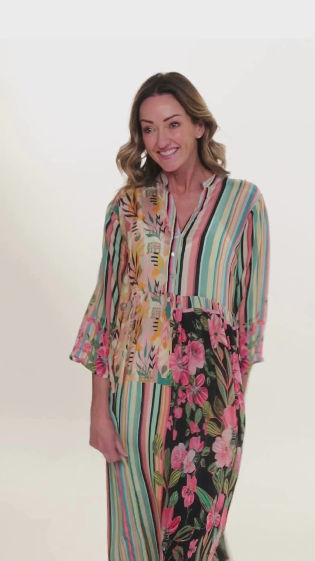 From our Silvermaple Collection, the Erin V-Neck Dress brings a fresh, feminine feel to relaxed dressing. Crafted from lightweight viscose crepe, it drapes softly with a breathable, easy-to-wear finish. The Botanic Stripe print combines soft pastel stripes with panels of striking florals, blending gentle tones with bursts of colour for a look that’s both elegant and uplifting. With a flattering V-neckline, extended empire waist, and relaxed pull-on silhouette, this dress is the perfect mix of comfort and charm.