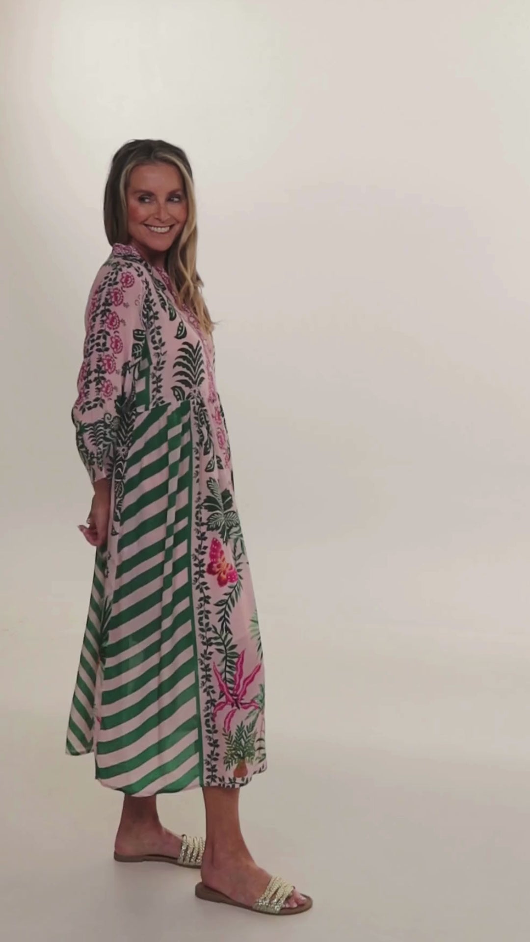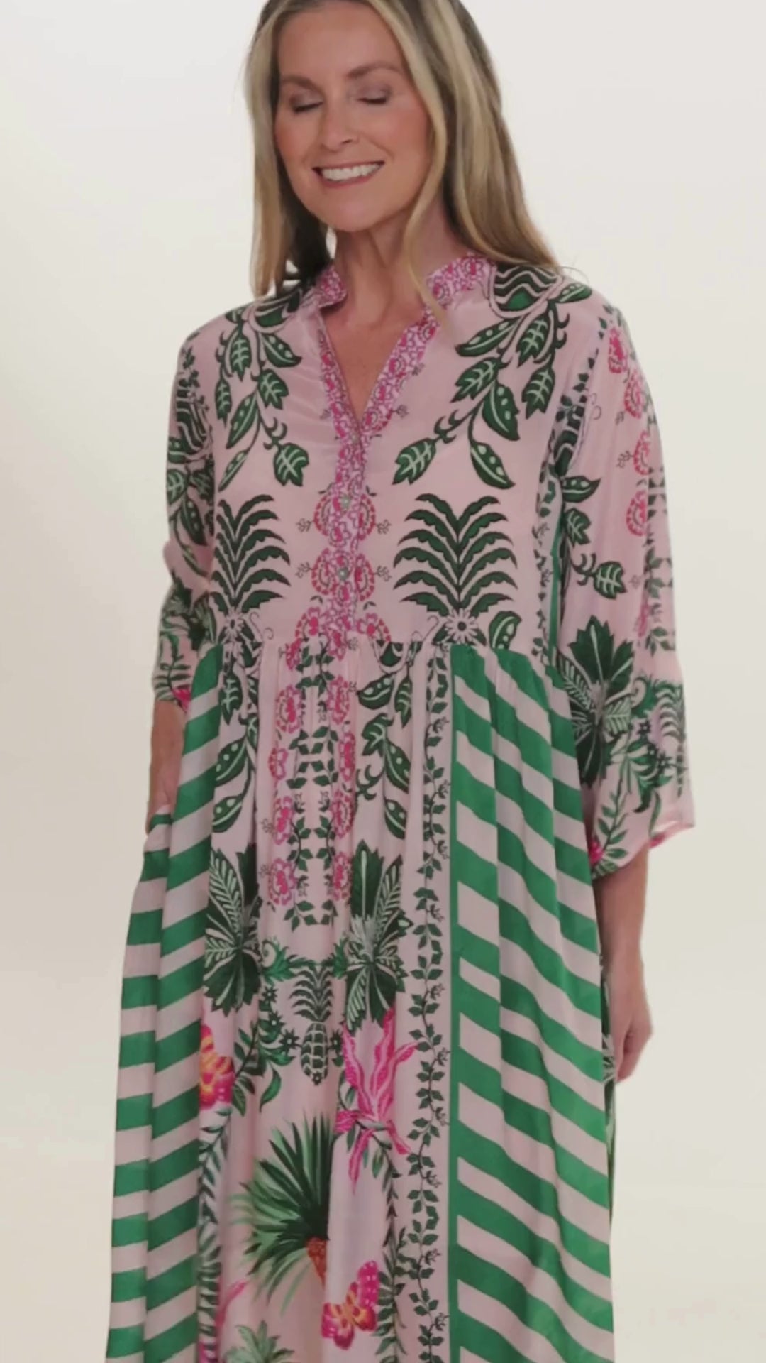 From our Silvermaple Collection, the Erin V-Neck Dress captures the essence of relaxed summer elegance. Crafted from soft, breathable viscose crepe, it falls beautifully over the body with an airy, lightweight feel. The Palm Court print features a light pink base adorned with lush green palms and patterned green stripes, creating a fresh, tropical-inspired look with a refined edge. With its flattering V-neckline, extended empire waist, and easy pull-on design, this dress blends comfort with effortless sophistication.