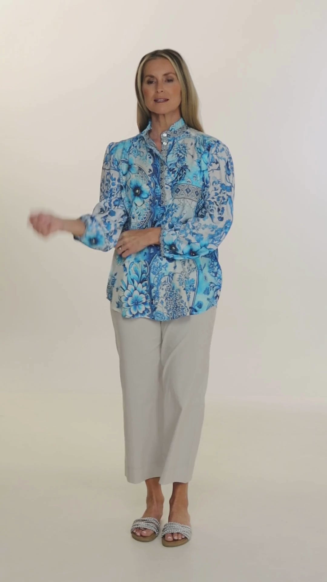 The Mira Frill Shirt in Blue Casablanca is a vibrant, statement-making piece that evokes the exotic charm of its namesake city. Crafted from breathable viscose linen, it drapes beautifully while keeping you comfortable throughout the day. The bold print features large, Casablanca-inspired blue florals layered over soft geometric motifs on a crisp white base, creating a striking, contemporary aesthetic. Designed with a mock-style neckline with a subtle frill and a partial button placket, it offers relaxed balloon sleeves and a modern, flattering silhouette.