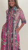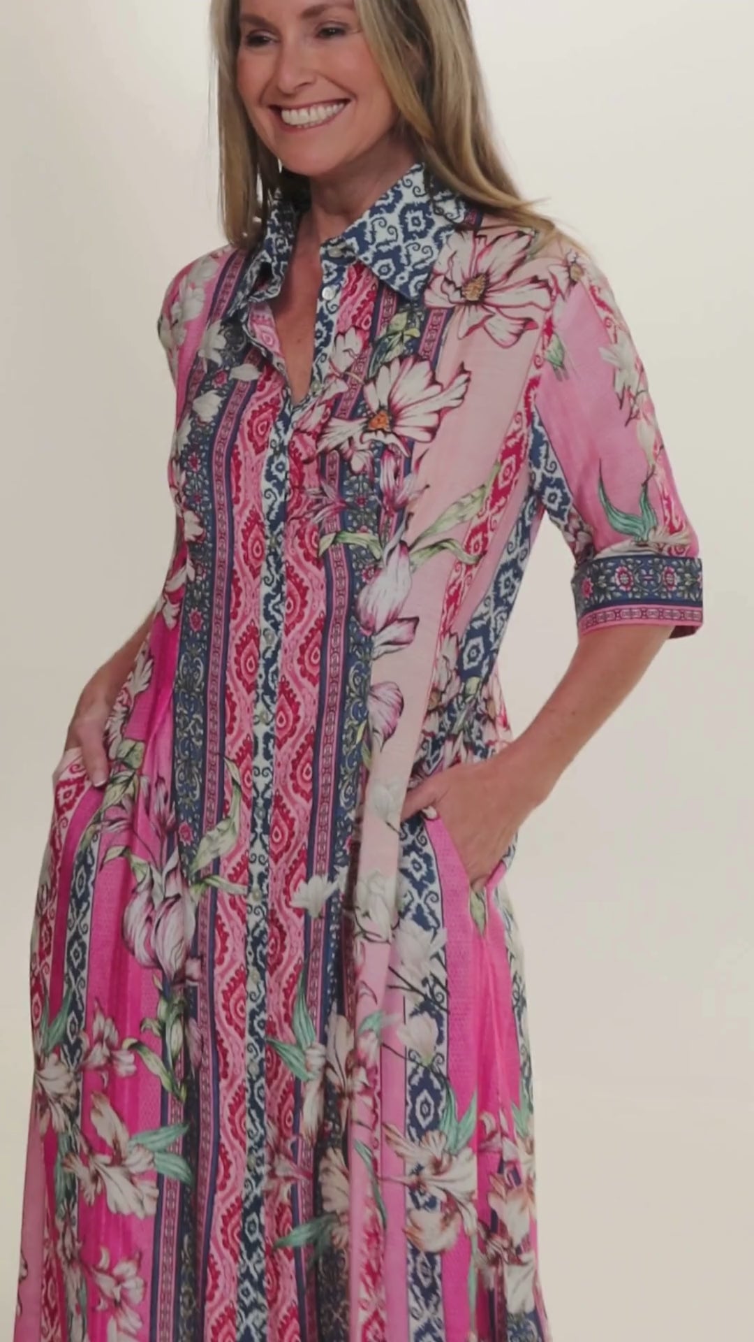 The Quinn Shirt Dress in Sweet Serenade is a breezy, versatile piece that brings effortless elegance to your wardrobe. Crafted from a viscose linen blend, it feels soft, breathable, and perfect for warm-weather wear. The vertical stripe pattern in pinks and soft navy, accented with geometric details and delicate white florals, creates a playful yet refined aesthetic. Designed as a classic shirt dress, it features a collared neckline, button-through front, and relaxed elbow-length sleeves, finished in a flattering midi length.