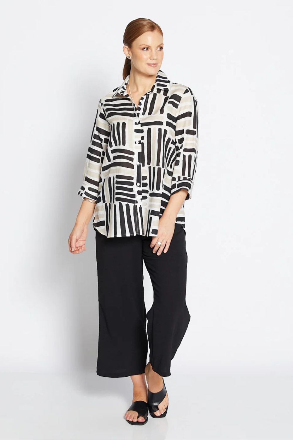 The Regis Shirt by Philosophy Australia brings timeless style and versatility to your wardrobe. Crafted from a premium cotton–linen blend, it offers breathability with reduced creasing, making it perfect for travel or everyday wear. The exclusive Gazebo Black print adds a bold, contemporary touch, while the collared neckline, 3/4 sleeves, and button-through front create a polished yet relaxed silhouette.