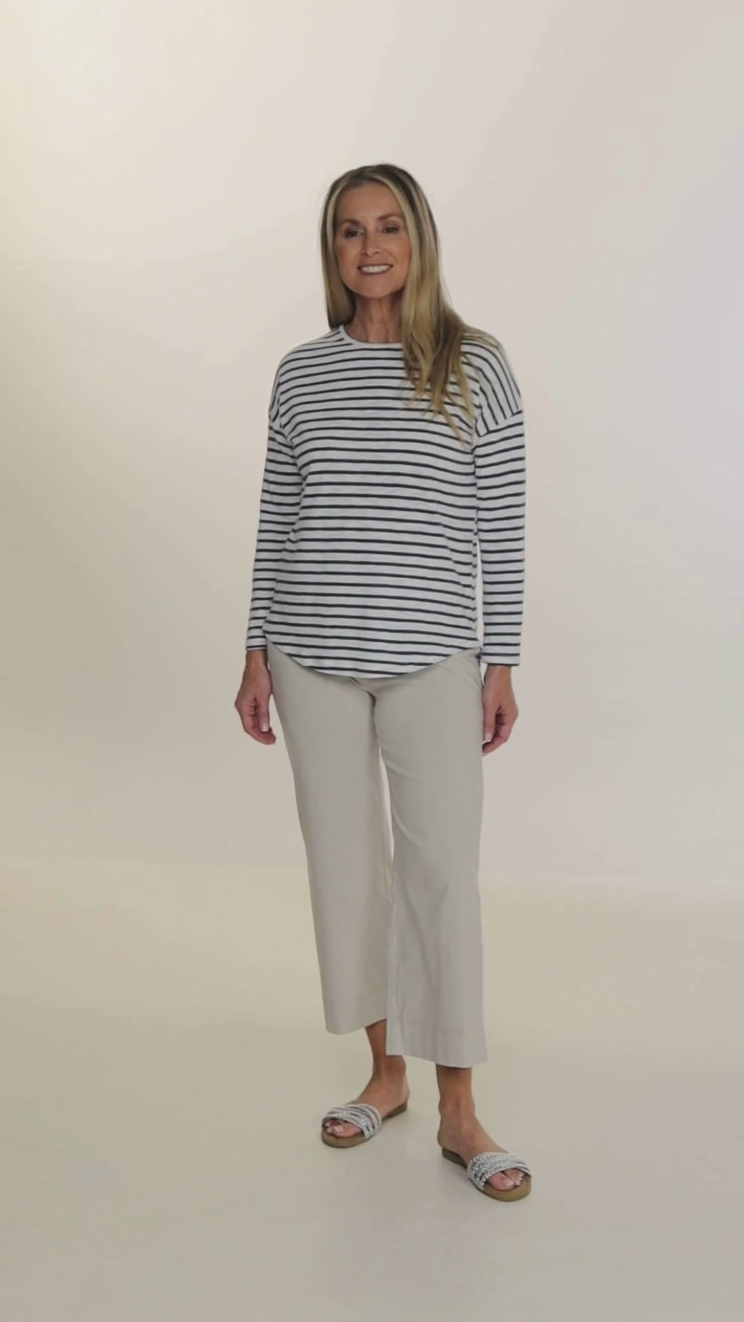 The Stella Stripe Top from our Silvermaple Collection introduces a fresh take on everyday dressing. Crafted in a soft cotton blend, it features a round neckline, dropped shoulders and a curved hi-low hem for easy layering. Finished in a timeless stripe, this versatile style is available in five colours to suit every wardrobe.