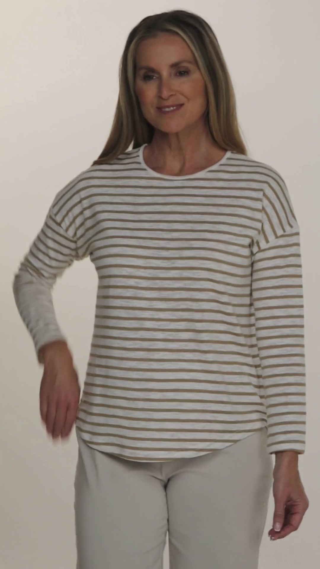 The Stella Stripe Top from our Silvermaple Collection introduces a fresh take on everyday dressing. Crafted in a soft cotton blend, it features a round neckline, dropped shoulders and a curved hi-low hem for easy layering. Finished in a timeless stripe, this versatile style is available in five colours to suit every wardrobe.