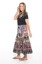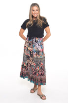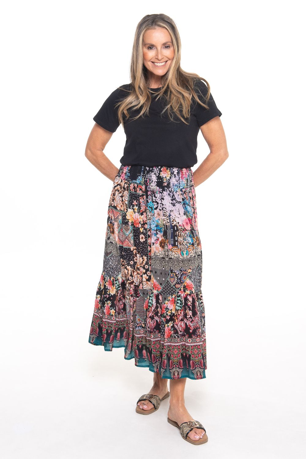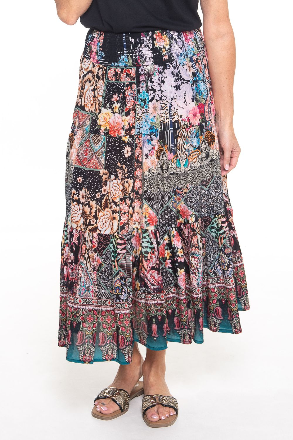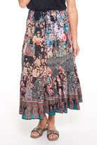A vibrant celebration of colour and pattern, the Sydney Maxi Skirt in Lush Reverie is your go-to statement piece for sun-drenched days and balmy evenings. Crafted from lightweight 100% viscose crepe, it flows effortlessly with every step, offering breathable comfort and a flattering silhouette. The soft, smocked waistband provides an easy, pull-on fit while the cascading tiered panels bring beautiful movement and visual interest. This skirt features a rich mosaic of florals, paisleys, and geometric motifs in a lush palette of coral, aqua, blush, and black.