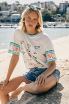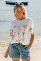 A playful twist on casual dressing, the Cin Cin Top – Happy Hour brings a splash of fun to your everyday look. Crafted from soft, breathable cotton, this relaxed tee features a colourful lineup of martini and cocktail sketches that capture the carefree spirit of summer. Finished with contrast sleeve bands and neckline trim, it’s the perfect mix of comfort and personality.