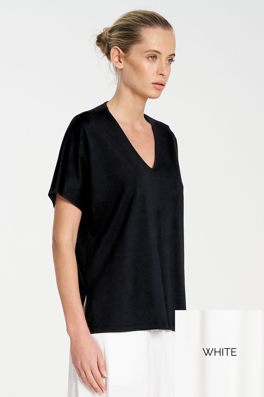 Deep V neckline – elongates and flatters the neckline