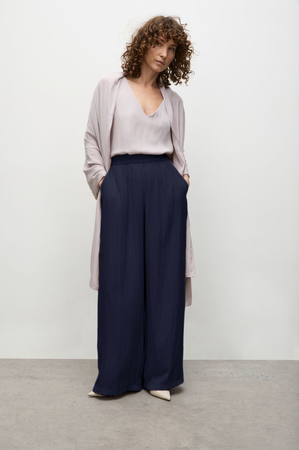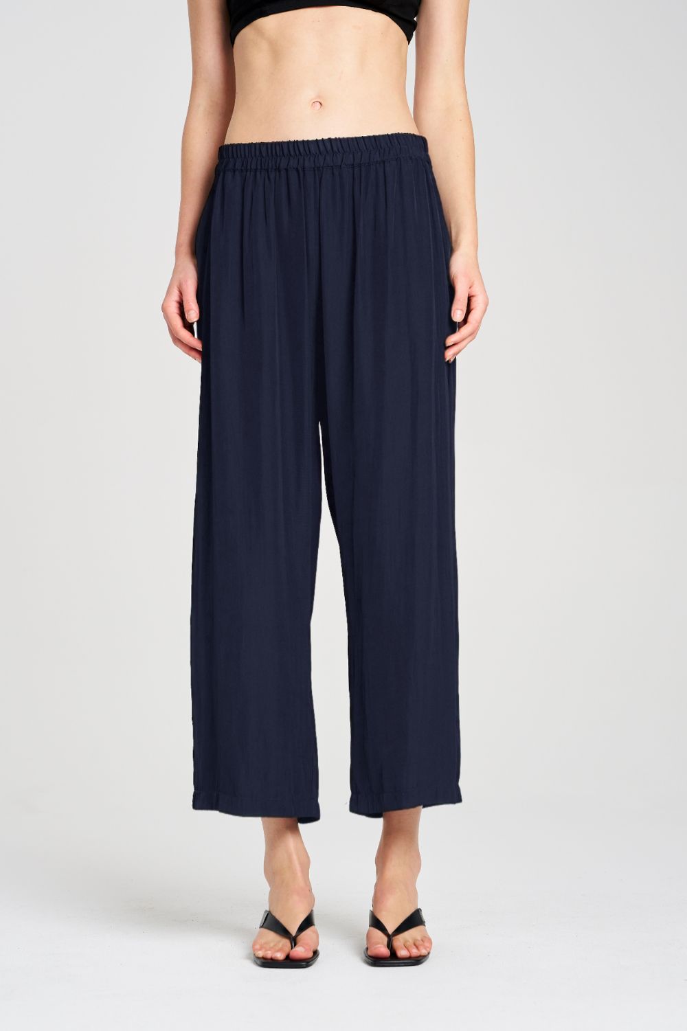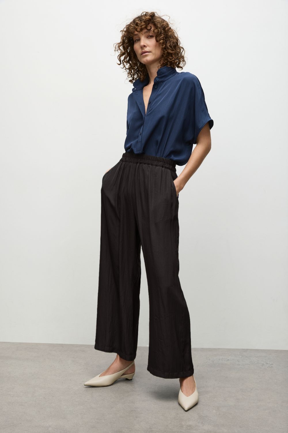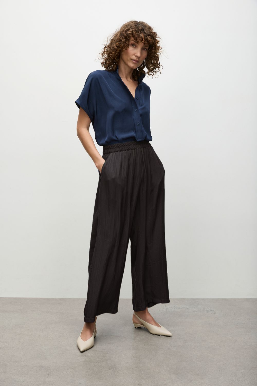 A refined wardrobe staple, the Mela Purdie Pace Pant in Black brings together ease and elegance in a breezy wide-leg silhouette. Crafted from signature Mache – a fluid, Japanese-origin fabric known for its subtle sheen and luxurious feel – these cropped pants are designed for effortless movement. The elasticised waistband and hip pockets offer all-day comfort, while the slightly cropped length makes them perfect for showing off a statement shoe.