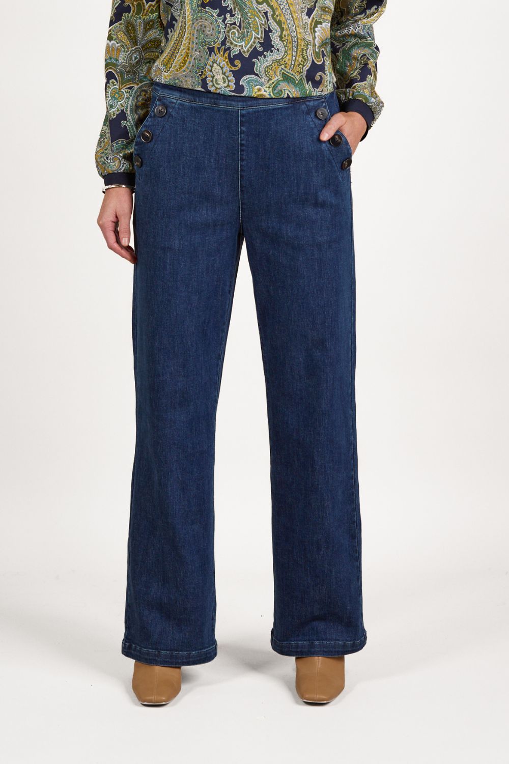 The Vassalli Wide Leg Jean in Dark Indigo offers a flattering fit with just the right amount of stretch. Crafted from a cotton-rich blend with a hint of elastane, these jeans move with you while maintaining their shape. The elastic back waistband and flat front create a smooth silhouette, while the wide-leg cut exudes timeless elegance. Thoughtful details like front angled pockets with button accents and sleek back welt pockets enhance the design. The signature ‘Vassalli’ embroidery above the right back pocket adds a refined finishing touch.