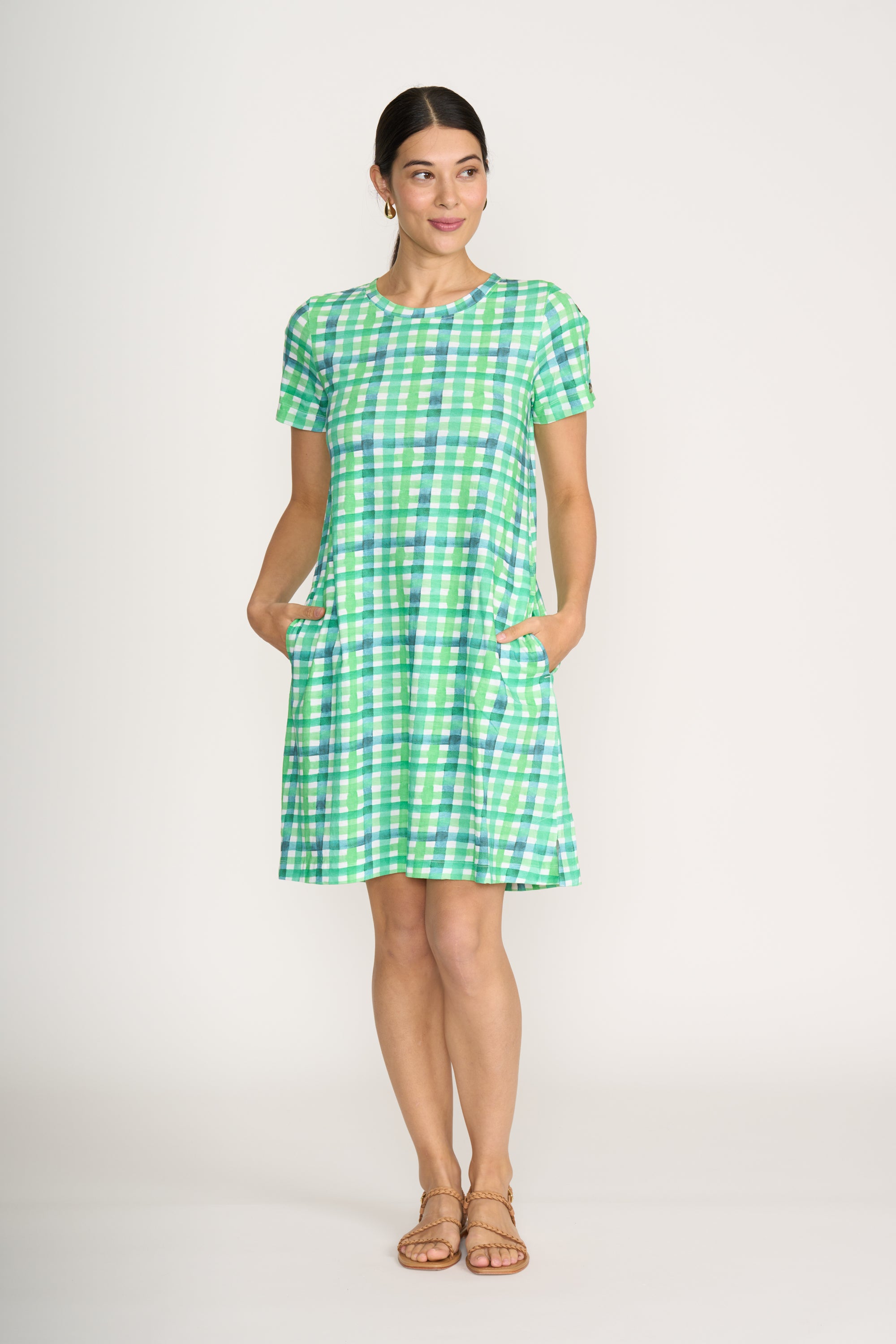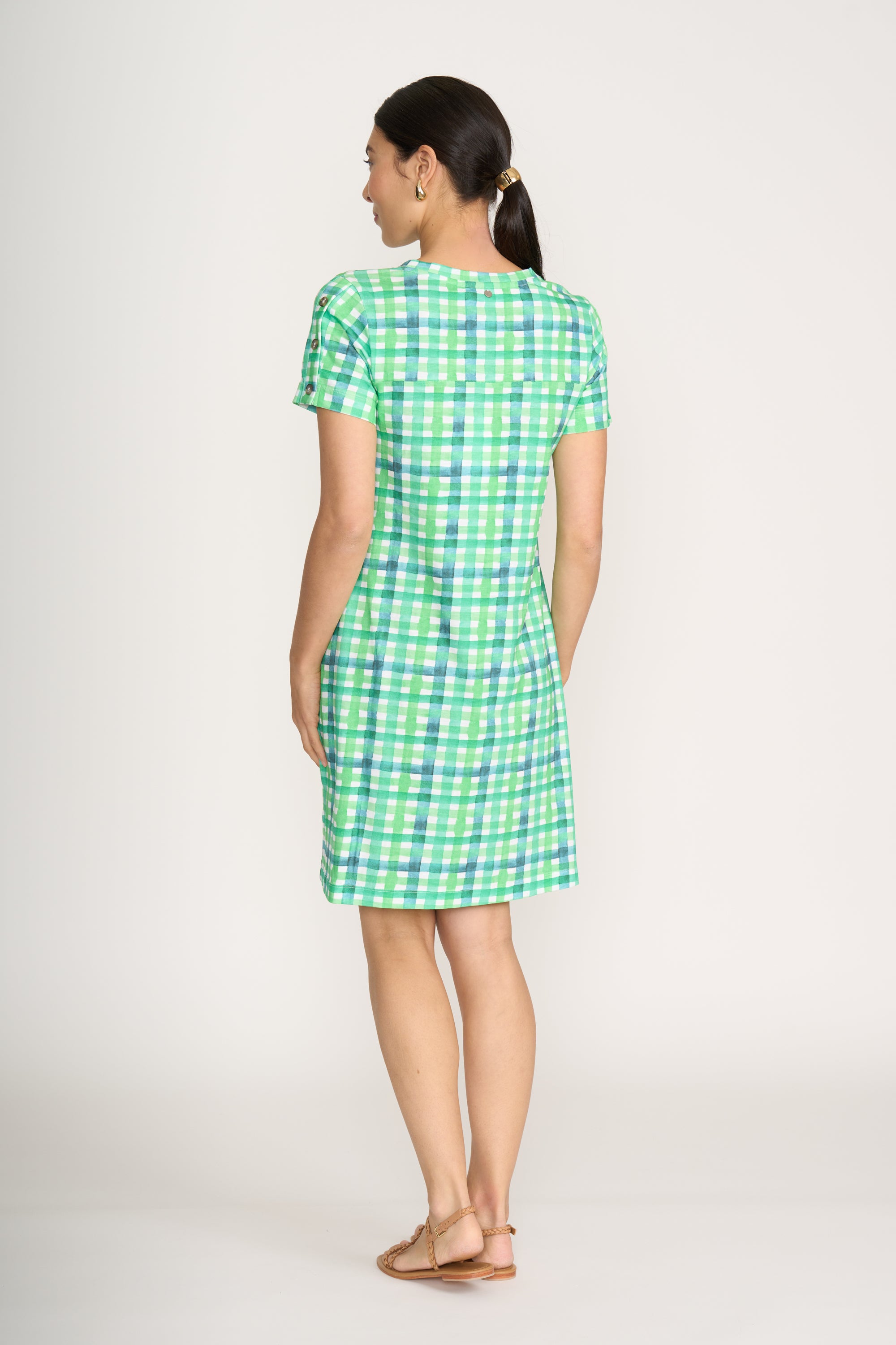 An easy throw-on style for warm, sunny days, the Worth The Hype Dress brings fresh energy to your everyday wardrobe. Crafted from soft 100% cotton slub, it’s lightweight, breathable, and designed for all-day comfort. The relaxed silhouette features a classic round neckline, short sleeves with button detail, and handy side pockets, while the playful green check print adds a vibrant touch of fun.