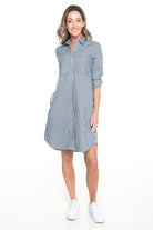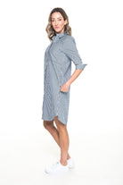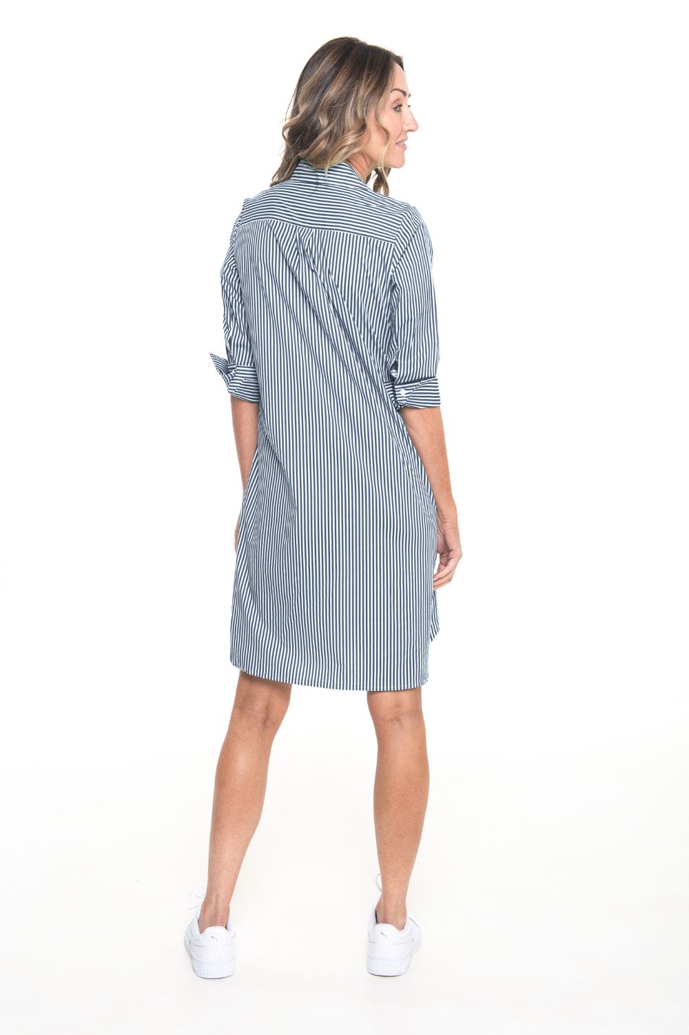 Smart yet relaxed, the Sierra Shirt Dress by Philosophy Australia is your go-to for easy, polished dressing. Crafted from a breathable cotton-elastane blend, it offers a soft feel with just the right amount of stretch for everyday comfort. The skinny navy and white stripe adds a timeless nautical-inspired touch, while the shirt collar, concealed button placket, and knee-length cut keep the silhouette crisp and flattering. Side pockets and a gentle A-line shape complete this versatile favourite — ideal for workdays, weekends, and holiday escapes alike.