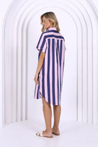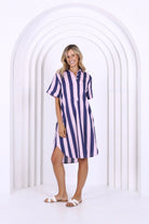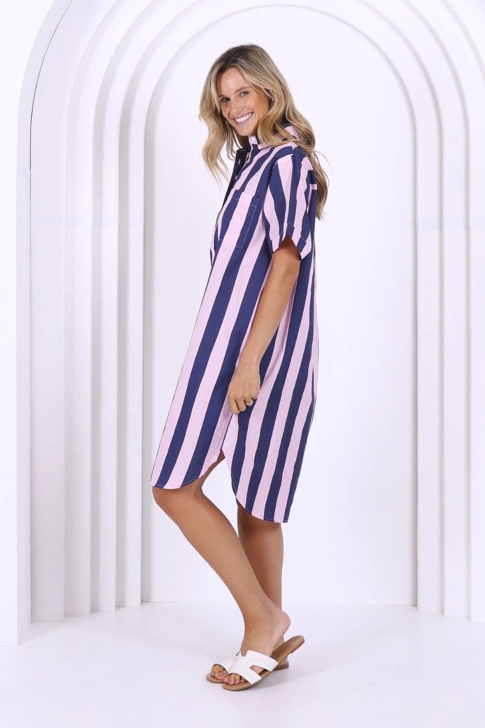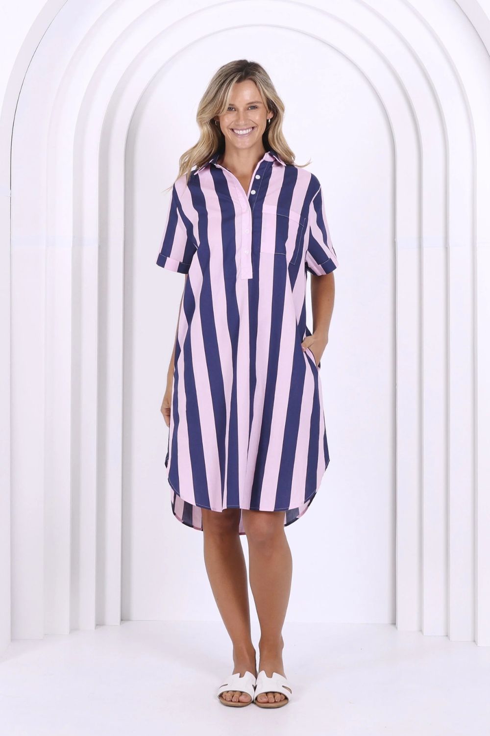 A perfect mix of comfort and style, the Karina Stripe Dress is crafted from soft, breathable cotton and designed with playful navy and pink stripes. Its mid-length silhouette, shirt-style collar, and curved hem create a flattering shape, while practical front and side pockets add a touch of everyday ease.