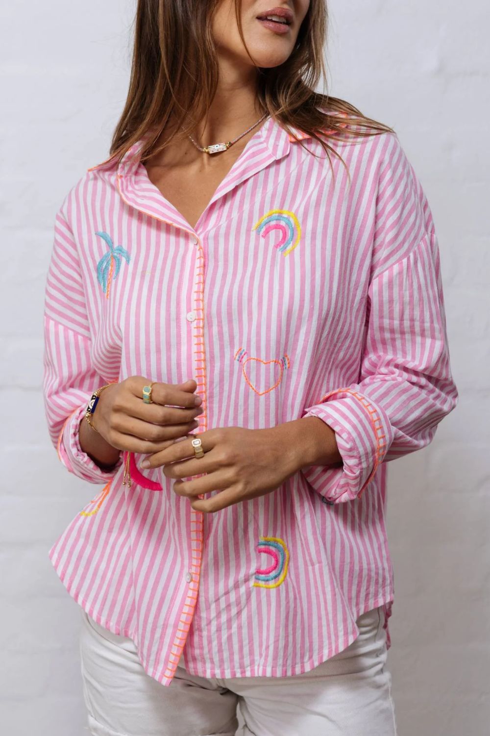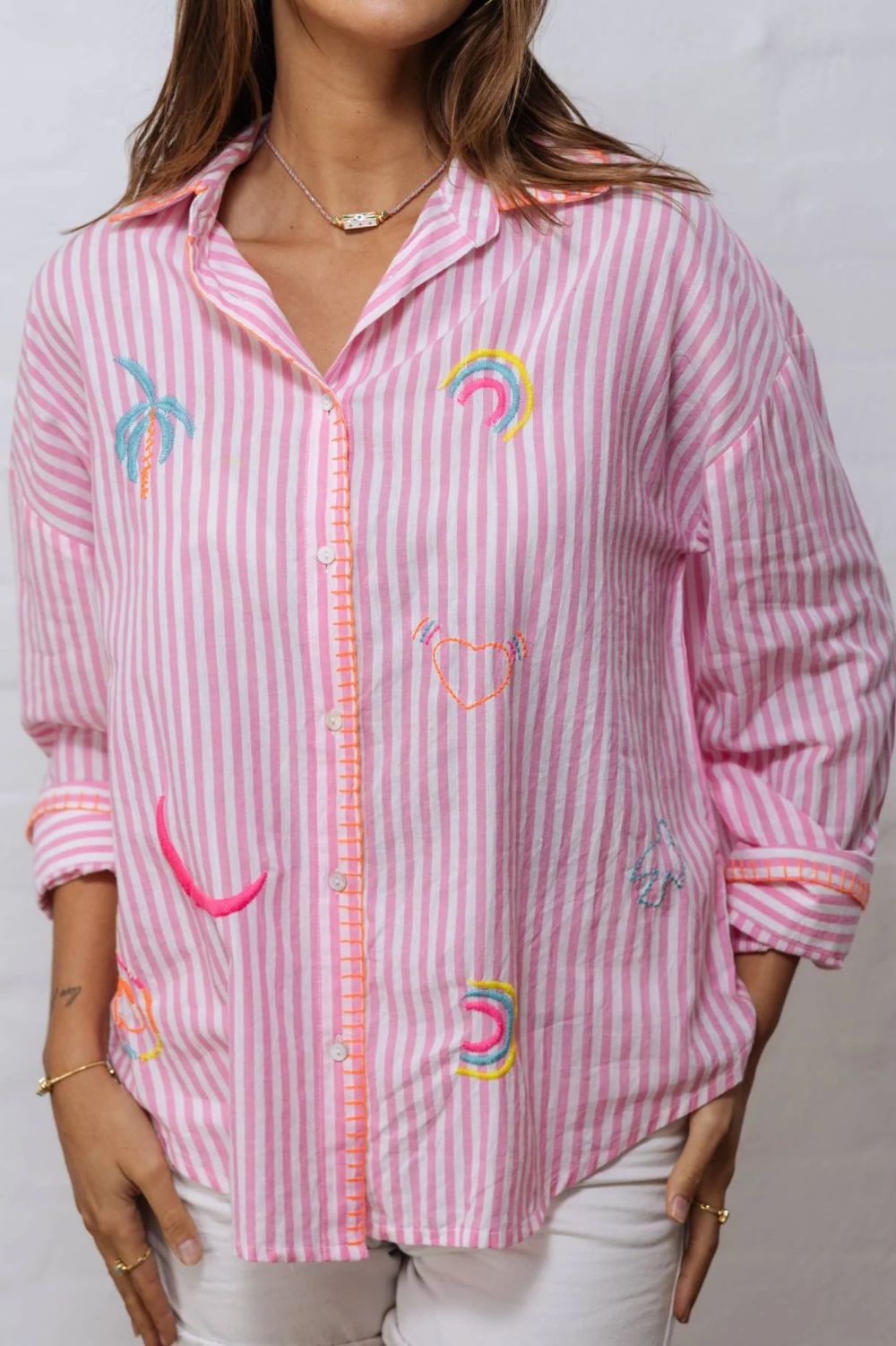 Bring a playful pop of colour to your wardrobe with the Solana Shirt | Pink Sorbet Stripe. Crafted from 100% cotton, this breezy button-through shirt features candy-pink stripes accented with vibrant embroidered motifs — rainbows, hearts, and palm trees — that capture the carefree spirit of summer. Bright orange stitching along the button placket and cuffs adds a joyful contrast, while the words “La Dolce Vita” are embroidered across the back in vivid orange thread, celebrating the sweet life in true sunshine style. The relaxed silhouette ensures easy comfort and effortless charm.