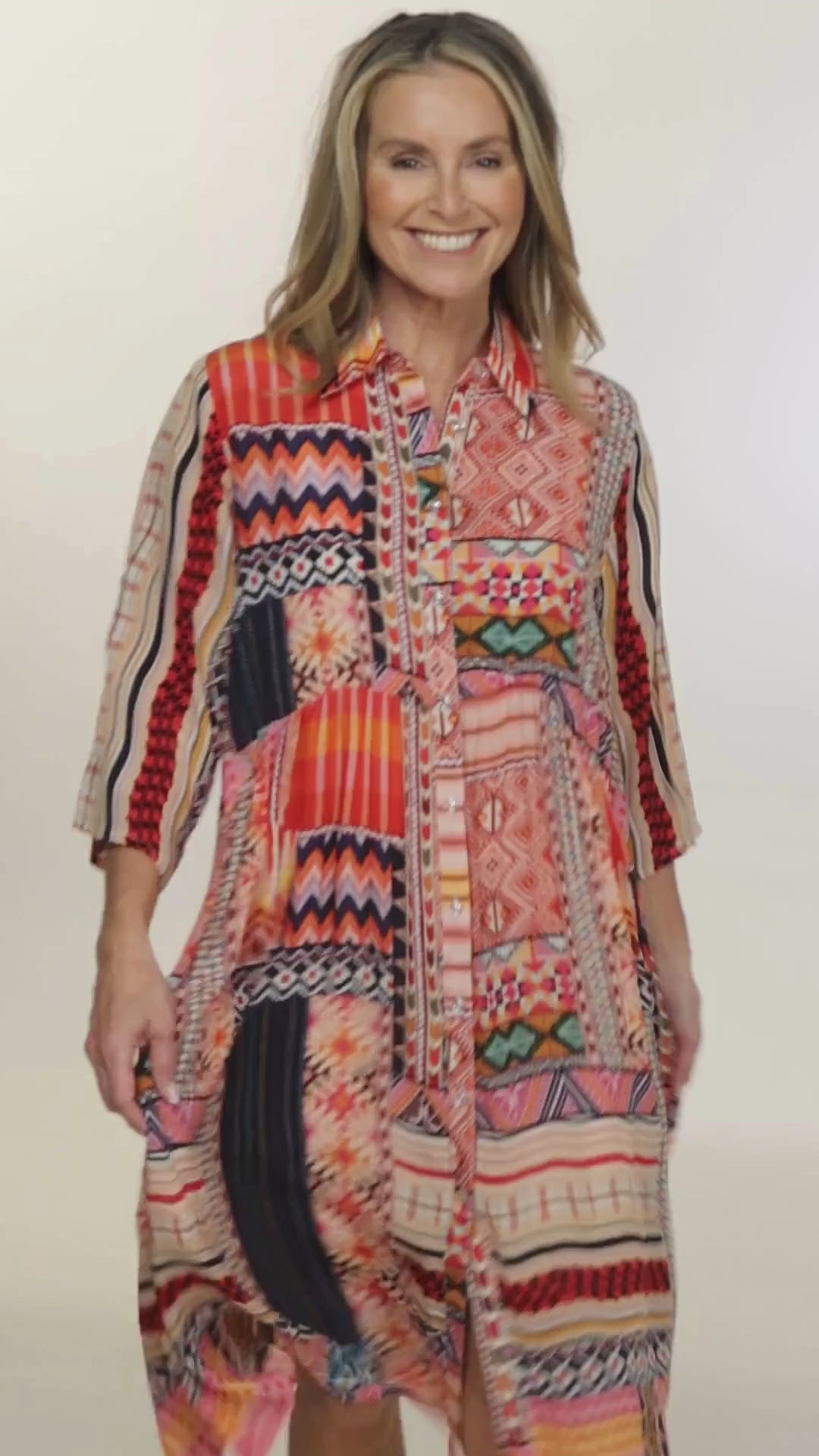 Celeste Button Through Dress in Tequila Sunrise brings a burst of vibrant energy to your wardrobe, perfect for those who love colour and playful print. Crafted from lightweight fabric, it offers a relaxed silhouette that flatters effortlessly. This colourway bursts with vibrant reds, corals, and pops of green and pink, arranged in an eclectic patchwork of stripes, geometrics and abstract florals—capturing the lively energy of a summer fiesta.