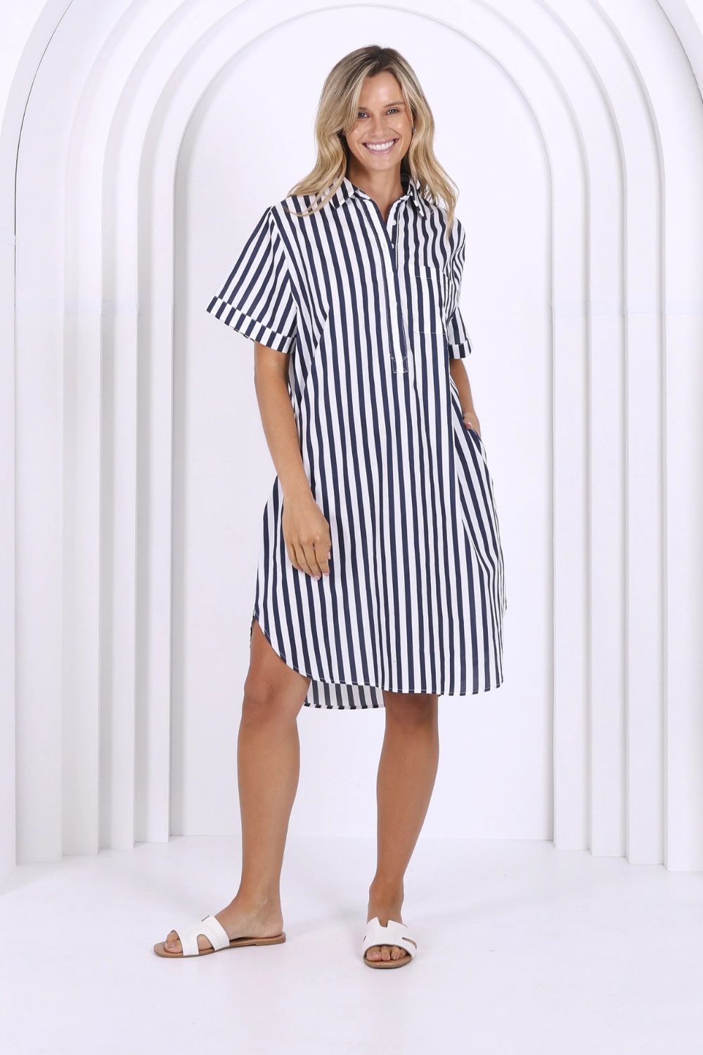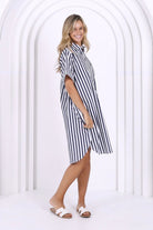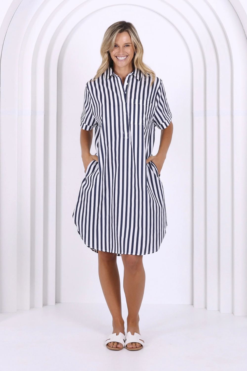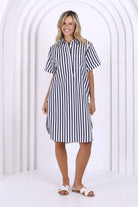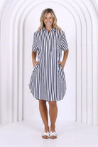 A perfect mix of comfort and style, the Karina Stripe Dress is crafted from soft, breathable cotton and designed with timeless navy and white stripes. Its mid-length silhouette, shirt-style collar, and curved hem create a flattering shape, while practical front and side pockets add a touch of everyday ease.