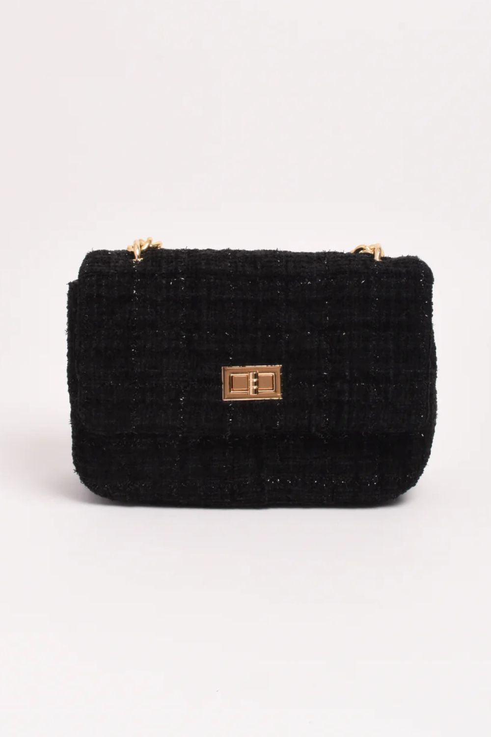 Add a touch of shimmer to your outfit with the Adorne Esme Tweed Small Bag, a chic and versatile accessory for day or night. Crafted in textured check fabric with subtle sparkle, it features a gold turn-lock closure and a convenient internal zip pocket for your essentials. Carry it elegantly by the gold chain handle or wear it hands-free with the optional crossbody chain.