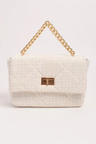 Add a touch of shimmer to your outfit with the Adorne Esme Tweed Small Bag, a chic and versatile accessory for day or night. Crafted in textured check fabric with subtle sparkle, it features a gold turn-lock closure and a convenient internal zip pocket for your essentials. Carry it elegantly by the gold chain handle or wear it hands-free with the optional crossbody chain.