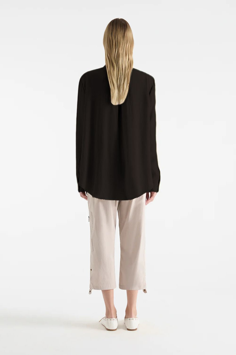Crafted from Mela Purdie’s luxurious Mache — a smooth, woven Japanese fabrication with a soft lustre and fluid drape — the Zip Front Shirt combines modern ease with refined tailoring. Designed with a structured collar, half-front zip, and full-length sleeves, this Australian-made style offers a polished silhouette with just the right touch of sophistication. The curved hemline adds movement and versatility, making it a timeless piece for both work and weekend wear.