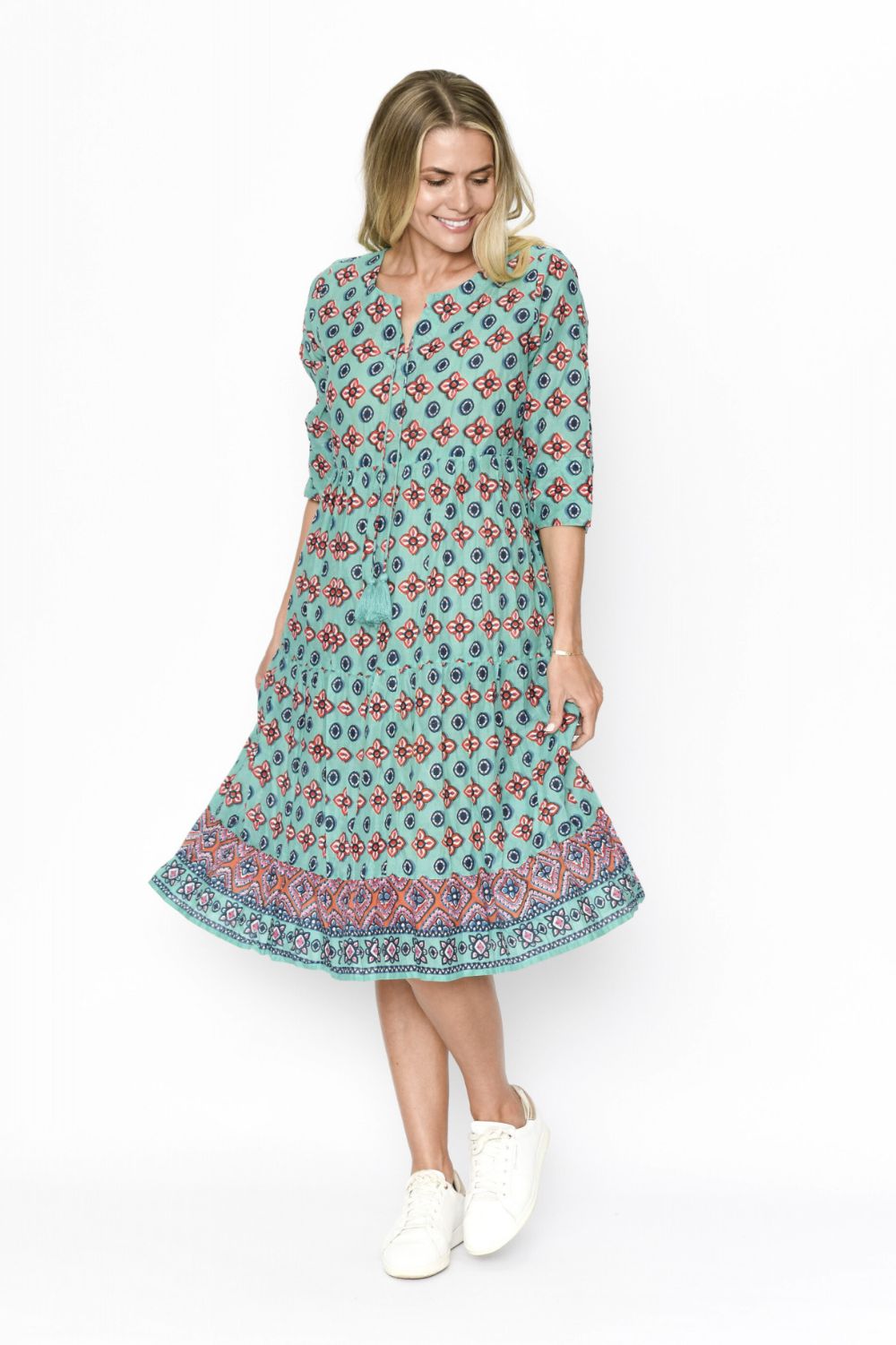 Effortless charm meets timeless comfort with the Rebecca Dress – a must-have for breezy, everyday elegance. Crafted from 100% cotton, this breathable and lightweight dress keeps you cool and comfortable, while the midi length and ¾ sleeves provide the perfect balance of coverage and ease. Playful tassel detailing adds a unique touch, making it a standout piece for any occasion.